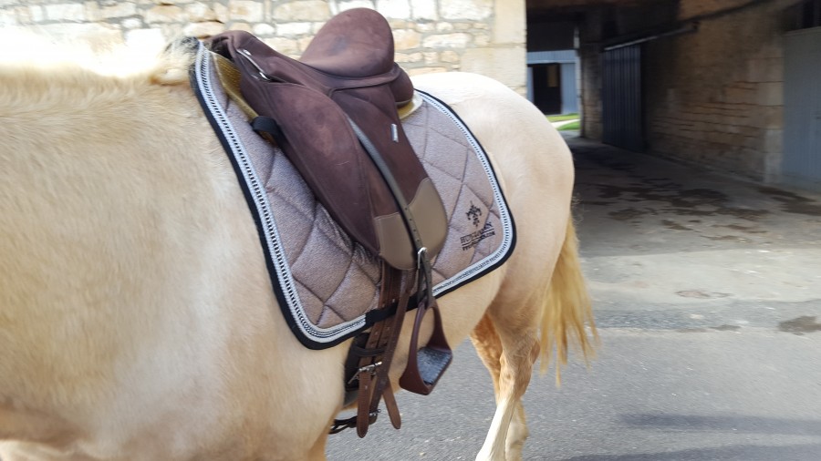 Sinon, aujourd'hui, j'ai eu un moment de lucidité. J'ai essayé mon amortisseur VIP sous ma selle de dressage. C'est un peu comme un gel élastomère dans des petites bubulles. Et alors que je l'avais essayé sous la selle de saut et que ça n'allait pas parce qu'il glissait, il ne me semblait pas l'avoir un jour utilisé sous la selle de dressage. Et c'était une révélation ! Pas dans l'attitude du poney hein. Mais là pour le coup, cet amortisseur ne modifie absolument pas le fitting de la selle ! Bref... J'ai un amortisseur idéal pour ma selle de dress dans ma sellerie depuis des lustres et je m'en étais pas rendue compte lol !