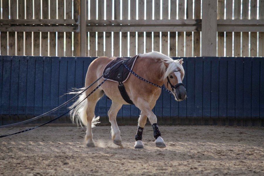 La longue-rêne du pauvre avec deux longes à tourner de couleurs différentes, trop classe. Si on continue à travailler régulièrement au sol faudra que j'investisse dans un truc qui tient la route, mais quand je vois les prix que ça coute et comme c'est souvent ultra rigide ... Mon rêve ce serait des cordes et biothane, pour la souplesse et la facilité d'entretien, mais je crois pas que ça existe =(