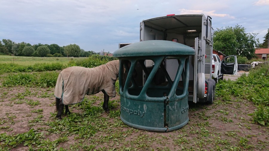 Bon, curieusement je pensais l'accès plus facile que ça. Ce qui est génial c'est que tout est arrondi, pas une seule arrête (surtout le toit, c'était important). Mais ce matin j'ai mis le licol à tout le monde un à un pour leur montrer que non ça ne mange pas et que oui, ils peuvent mettre leur tête dedans. Le minus avait déjà tout compris, les filles sont un peu plus sceptique. Le gris... a juste attendu d'avoir faim.