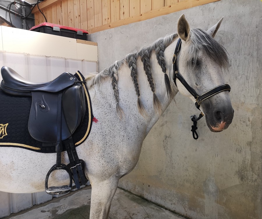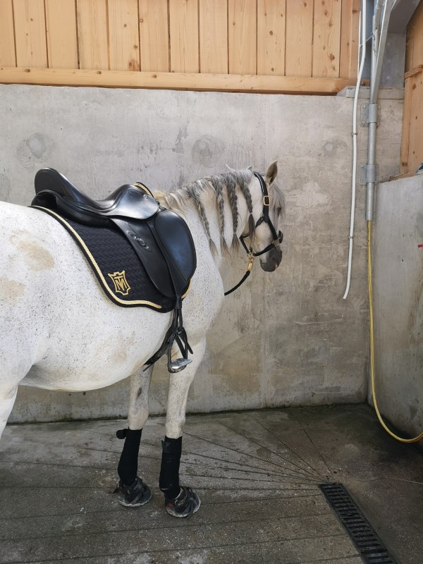 La selle de la voisine m'a foutu en l'air mon Eskadron Ice. Des traces noires partout. A voir si ça se voit sous ma selle. Sinon il faudrait que je le teigne parce que c'est super moche.
