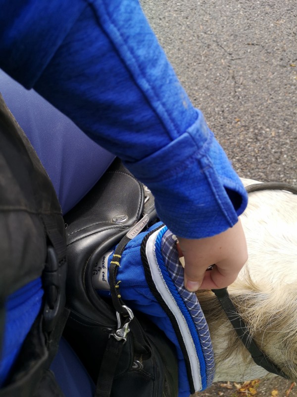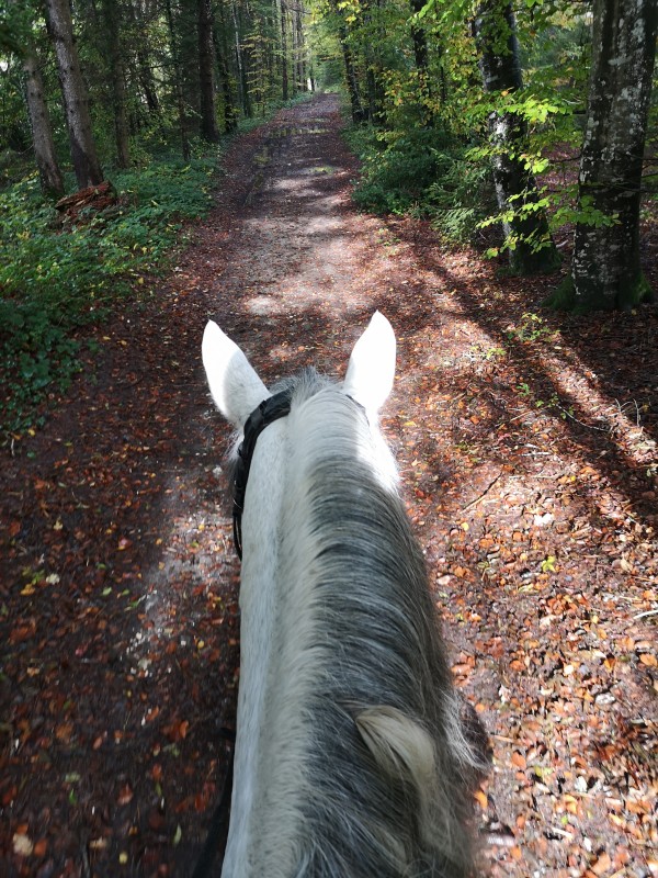 Petite balade au pas rênes a la couture voire a des moments rênes posées sur l'encolure histoire de changer les idées de poney mais sans forcer ! Super sage !