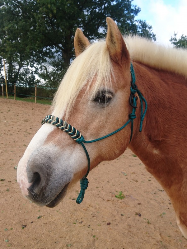 Je vous montre quand même mon seul achat de ces dernières semaines (quand le seul truc à faire avec son poney ces des soins, on économise le budget matos) : un licol corde vert-noir-or de chez Horse and Ropes <33