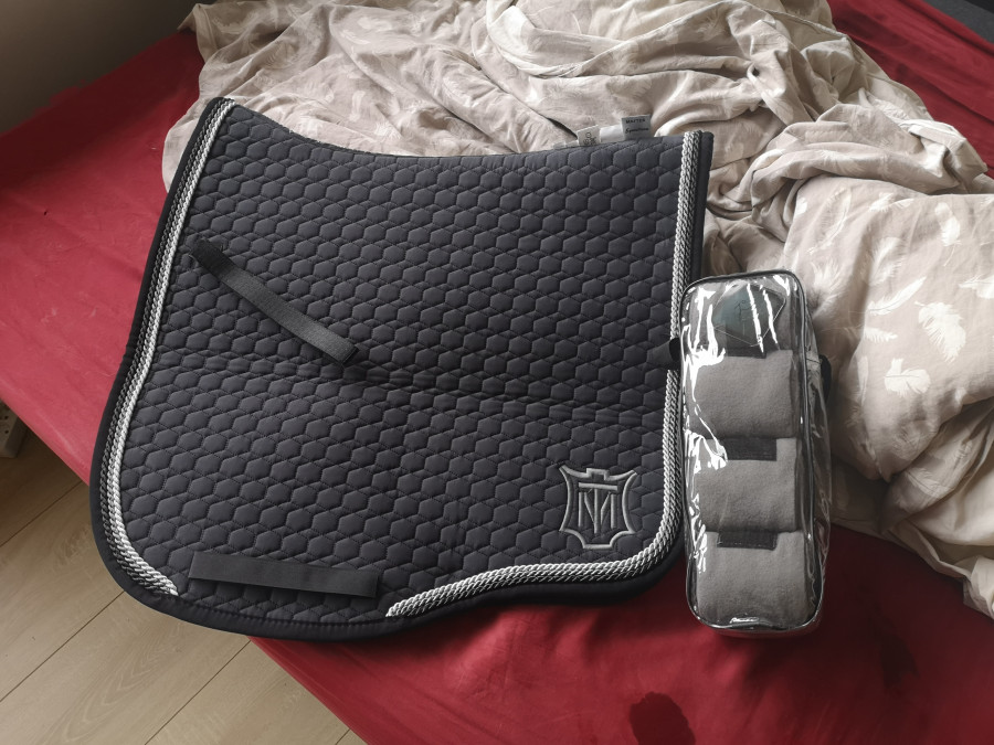 Je viens de faire un petit craquage chez Horze... Licol "confort" LeMieux en noir et gris foncé pour Sinji (en espérant que ce soit la bonne taille) (mais son licol en cuir est très mal coupé et de pauvre qualité, alors il était temps de le remplacer de toute façon), deux longes anti-panique en prévision du transport (et aussi parce que celle de Simbad a pris cher dernièrement), et la sangle mouton que Sinji aime beaucoup mais en 60 cette fois, au lieu de leur 70 qui ressemblait plutôt à un 80...