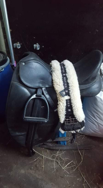 Voilà ce que je viens d’acheter pour 160.- (francs suisse) . Tout le lot: selle (Isabel Werth ancien modèle) Etrier, étrivières et sangle mattes et frais de port compris !!!