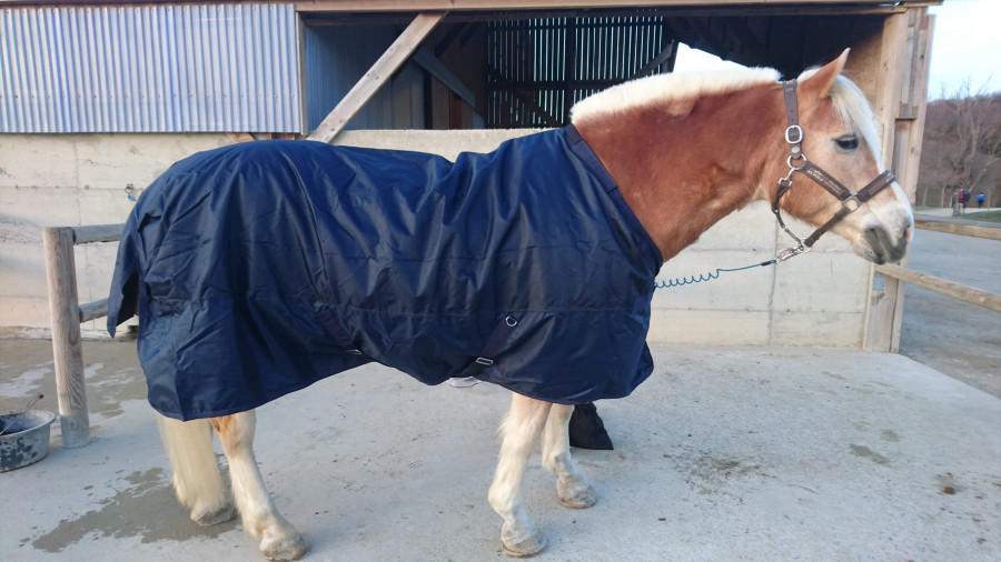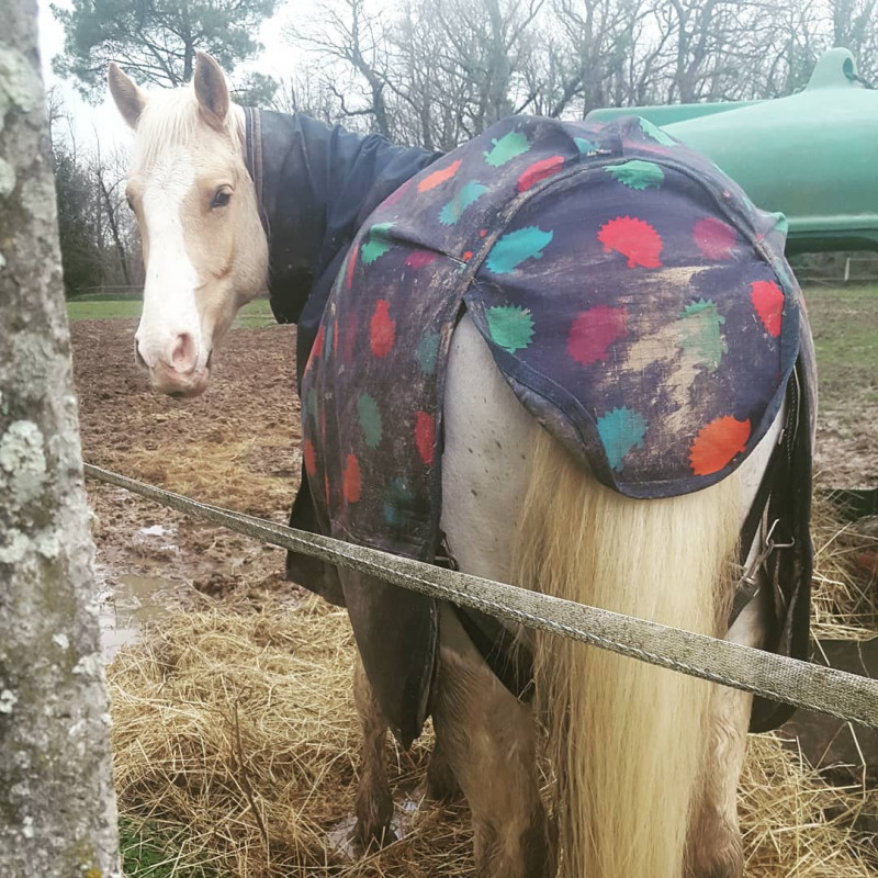 Après pour la couverture regarde pas trop le mien, je suis obligé de lui mettre du 150 alors qu'il fait 1m45 et 125cm de longueur de dos, du coup ça tombe toujours un peu étrangement