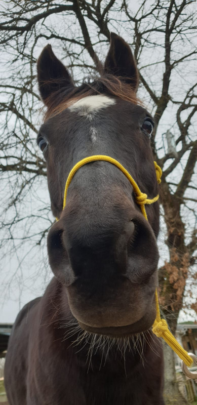 Il est super sensible et réactif en licol etho, du coup j'ai des doutes aussi sur la muserolle corde. C'est possible que ça soit tellement costaud que je ne puisse plus prendre de contact. Je nous fait une muserolle avec la corde pour essayer et j'attacherais ça à mon filet normal pour voir si ça lui va.