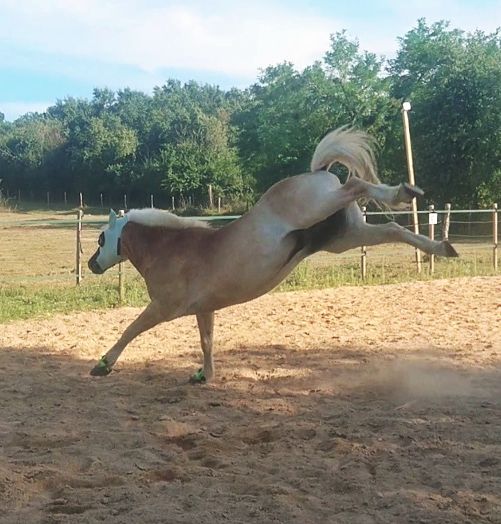 Avec la chaleur la grosse crise de headshaking est bien là comme l'année dernière mais à part ça, il pète le feu. La forme de ses pieds s'améliore au fil des parages, j'ai enfin réussi à récupérer la grosse merde qu'avait fait le véto y'a 1,5 ans, youpi ! Et avec ses hipposandales Flex Hoof Boots + des semelles dedans franchement il va vraiment bien.