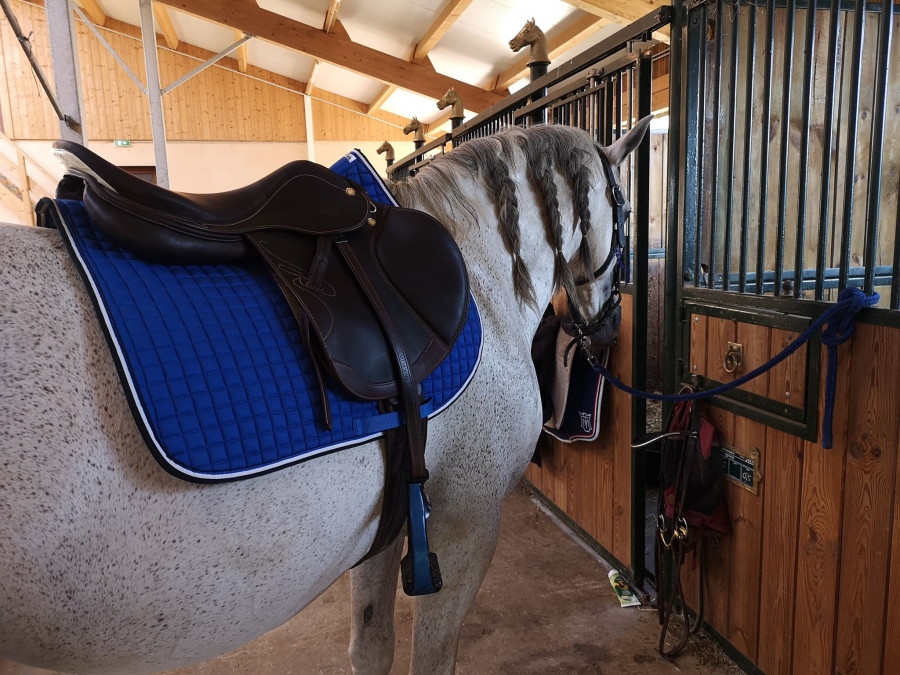 A savoir que mon bridon est en biothane gris clair, la selle de dressage est noir (wintec) et la selle de saut (devoucoux) marron mais avec amortisseur Mouton noir.