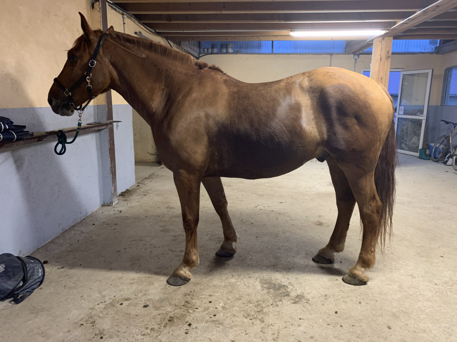 Il a voulu bouger la tête à l'attache, s'est coincé je ne sais pas comment, et paf, le licol en cuir qui saute. Bon mieux vaut ça que le cheval mais c'était le licol que je lui avais acheté quand il est arrivé.