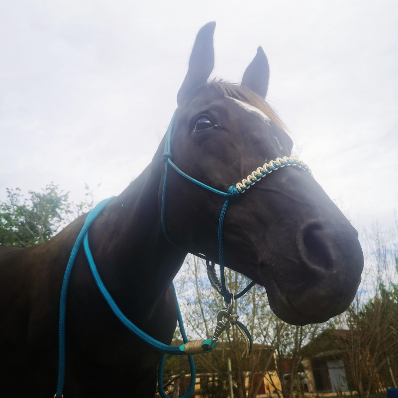 C'est pas très dress touch mais à la fois, on est pas près de refaire de la dress touch avant un moment, faut bien que je compense ! Je vous partage le nouvel ensemble etho de monsieur Az, bleu canard avec tressage blanc et "or clair", (que je trouvée personnellement plus beige qu'autre chose, mais bon)... Le système sous le licol etho dont je parlais la dernière fois, avec un anneau dessous pour éviter que le licol ne tourne et ne gêne le cheval quznd il fait le zozo ou s'accroche dedans est intéressant je trouve!