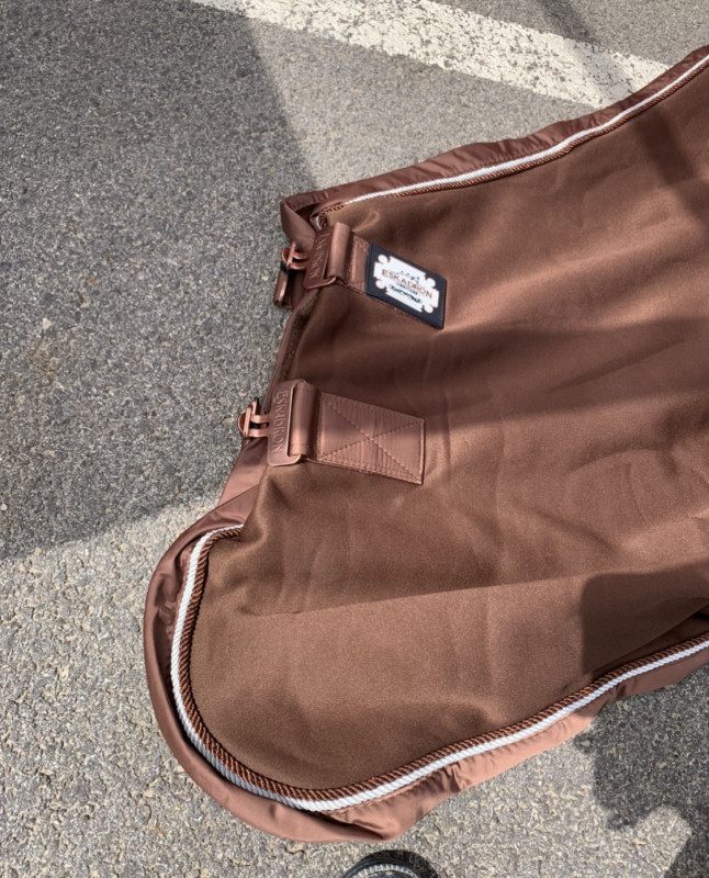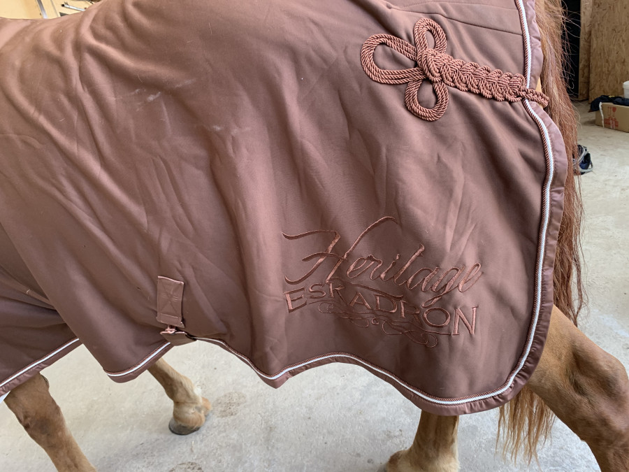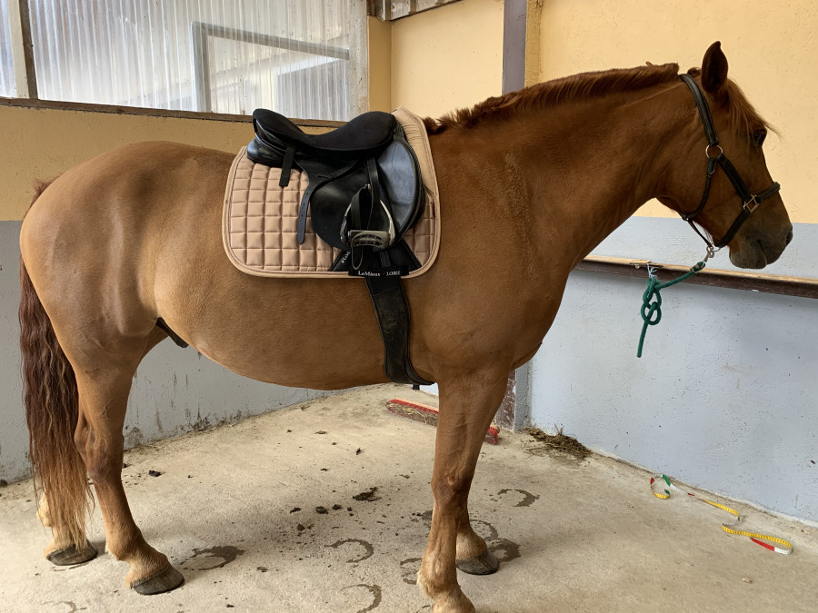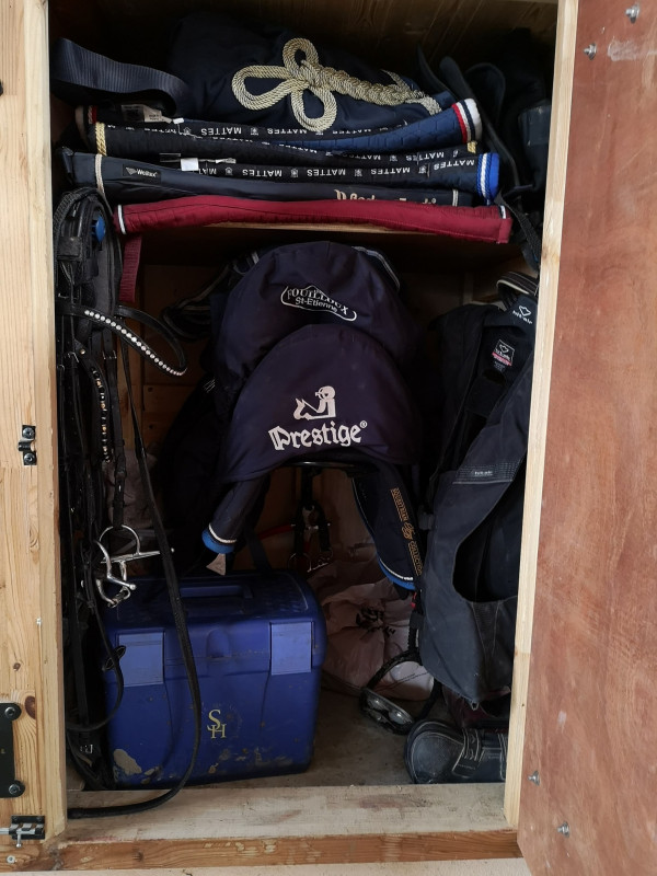 - mes 2 selles avec un vieux tapis en dessous sur le porte selle + mes 3 sangles (dress, bavette et longue classique)