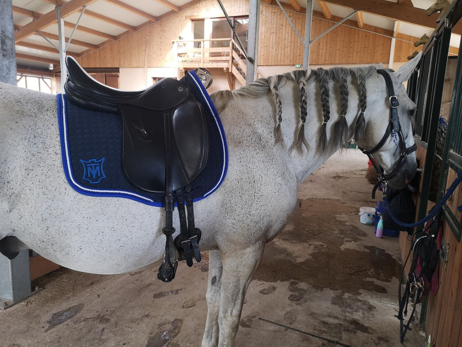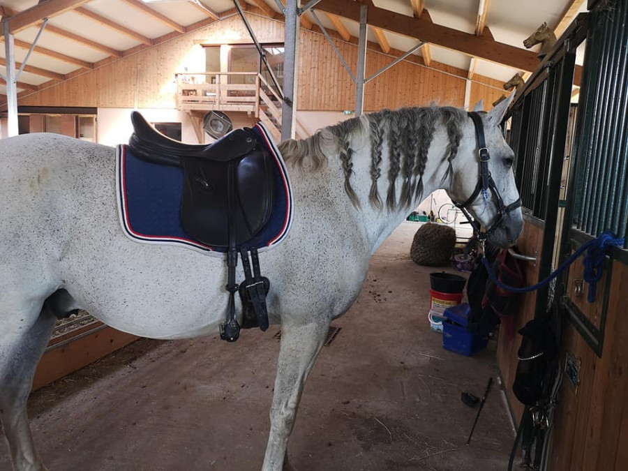 J’ai des bridons en biothane. Les derniers j’ai fait en couleurs neutres comme ça ça va avec tout. En gris pour la grise et j’ai un noir qui attend pour la bai brun.