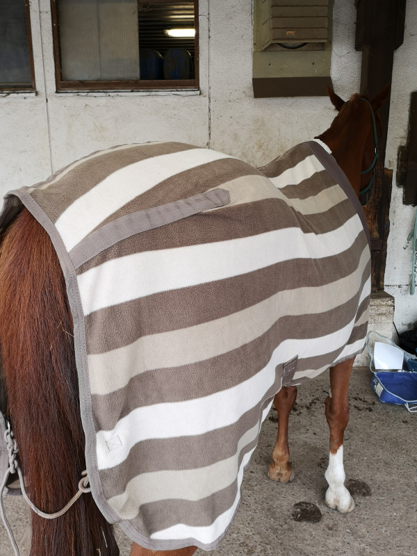 Aujourd'hui j'ai essayé la séchante à pois de feue ma voisine. Refus total du cheval. Il s'est gratté, roulé, il en voulait pas. Elle est toute feutrée, l'ancienne proprio lavait ses couvertures à haute température en machine. Elle est (devenue) trop petite.