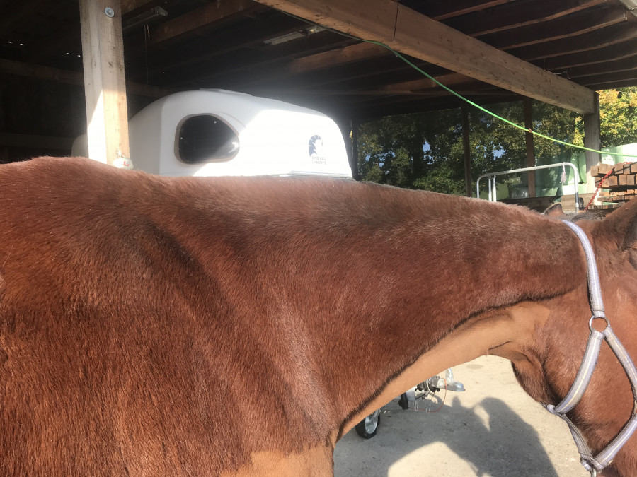J'ai vérifié que l'arcade était toujours la bonne, il y a l'arcade blanche dedans, avec la mesure, selon sa position de tête, il est pile entre la rouge et la blanche, pile sur le trait. Selon mes observations, vu que son dos se tend fort quand il le veut bien - et qu'on est d'accord : c'est le but recherché, j'ai décidé de laisser l'arcade blanche, car avec le tapis, c'est pas déconnant. J'ai mis l'amortisseur "bulles" (un VIP, pour ceux qui sont curieux), il est très fin, évite que la selle bouge.