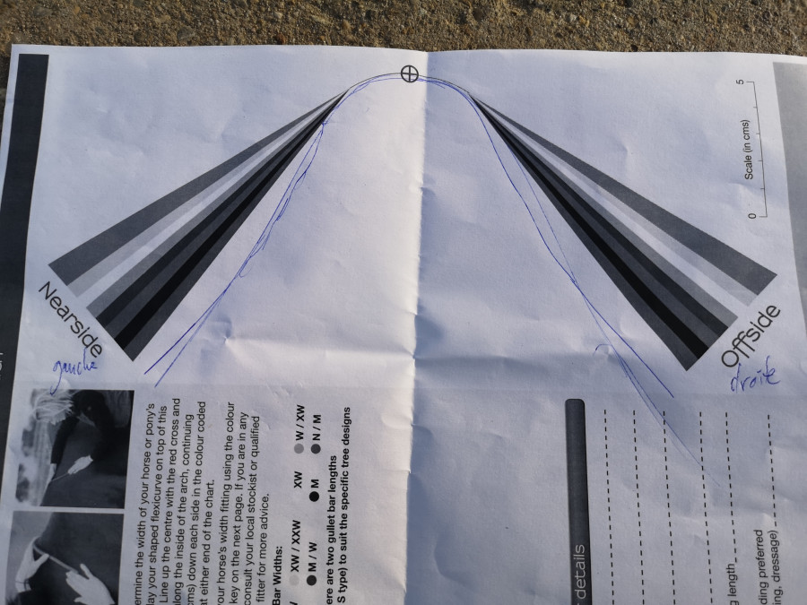 (le bon trait sur la largeur d'arcade, c'est celui qui est bien droit. Et oui j'étais bien au milieu sur la croix, le côté droit est encore tendu par rapport au gauche, c'est pour ça qu'il est encore plus étroit). En longueur j'ai environ 43cm. Du coup je laisse tomber la recherche de selle de suite ?