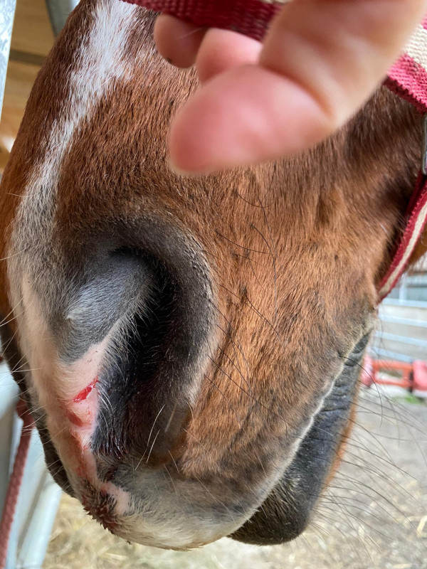 Bon ben voilà la troisième péripétie... il s réussi à se planter un truc dans le naseau