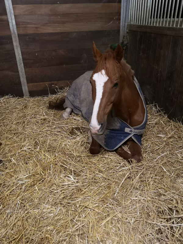 Je reçois des photos, et la je vois mon poney allongé en train de regarder son ventre...noooooon. A fond dans la Batmobile, je me retrouve à minuit à l'écurie, pour faire trotter un cheval certes un peu ballonné, mais pas franchement malade. Enfin il vaut mieux ça que l'inverse.
