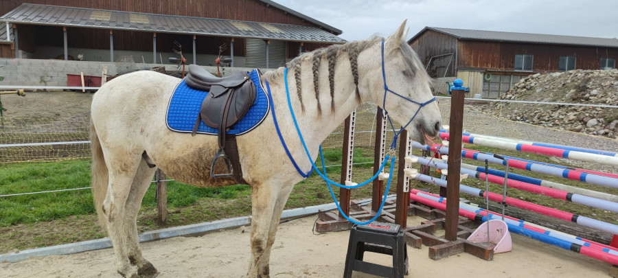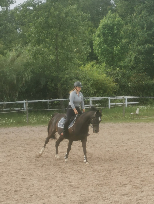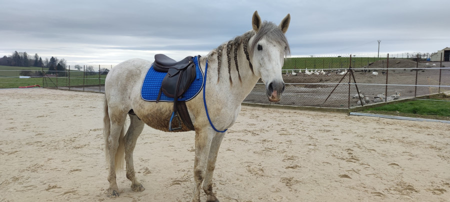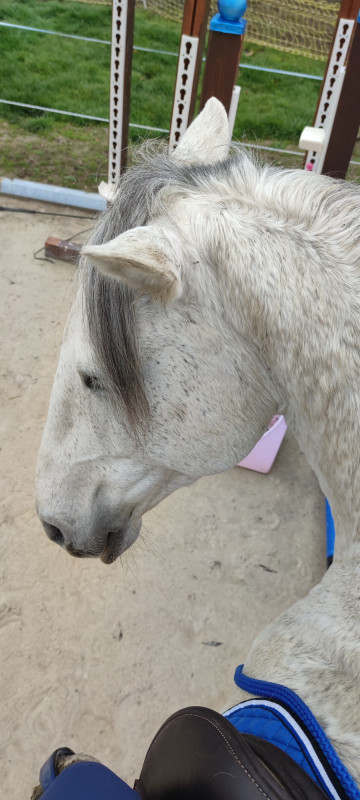 Ici pas de dress touch encore mais on y croit, un jour (hum). Aujourd'hui c'était LR avec un bridon havane, un surfaix moche noir et un tapis noir à paillettes, au secours. Mais le grumeau a été exemplaire dehors. On a étonné quelques promeneurs !