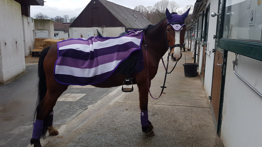 Dress touch du jour : tapis Lemieux Loire blackcurrant couvre reins camaieu de violet foncé violet clair - bonnet et bandes ES pour reprendre le camaieu (On garde bonnet et bandes Loire pour l ete)