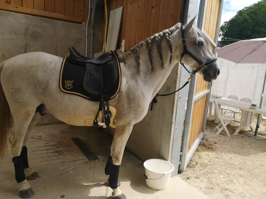Par contre, du vrai dressage avec une selle de saut ET un couvre reins, c'est mort pour les jambes isolées mdr : j'ai la jambe dans le couvre rein et le mollet dans le taquet. Et comme j'ai un poney un peu flemmard de la cession... D'ailleurs va falloir que j'y remédie.