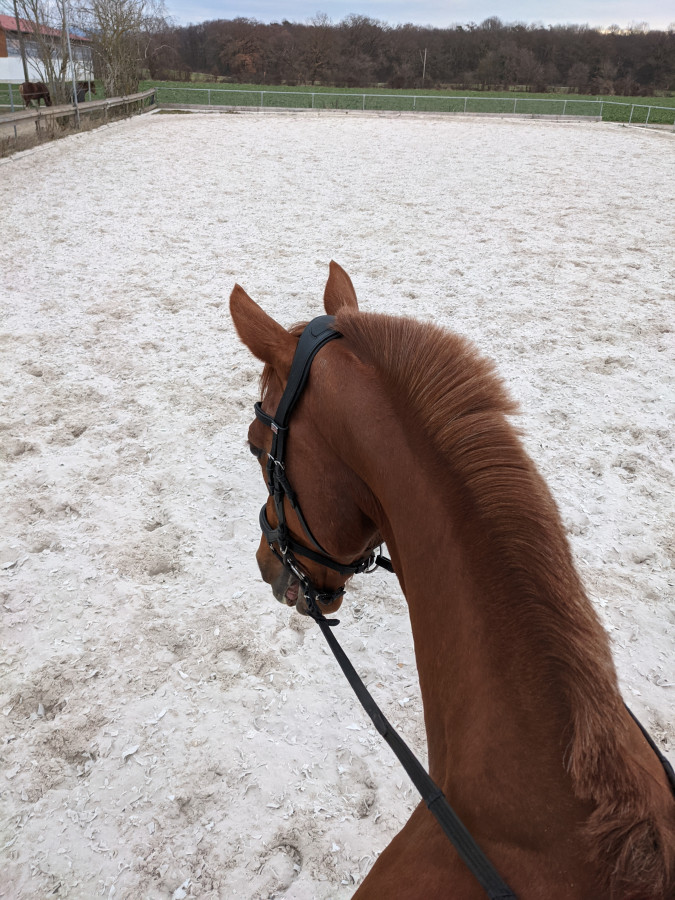 On va dans le manège pour le début, il a un peu essayé de tomber sur l'antérieur droit, de se creuser au début, je peux pas lui en vouloir d'essayer, surtout après 2 semaines. Sinon très appliqué et actif. La transition au sans céréales semble réussie.
