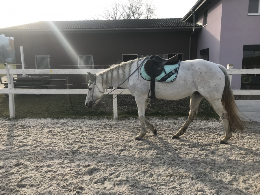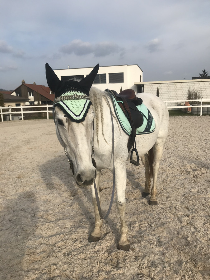 Pas tout à fait dress touch car selle de saut . Ma deuxième fille prépare son diplôme d’équitation suisse et elle a quelques petits cavaletti à passer. Elle me suivait avec la ponette pour se concentrer sur sa position .