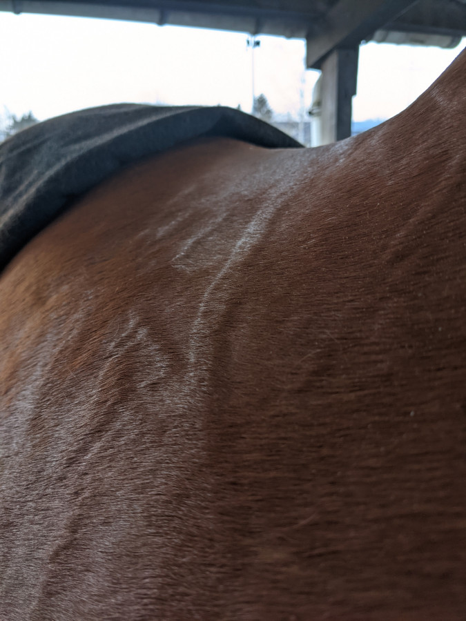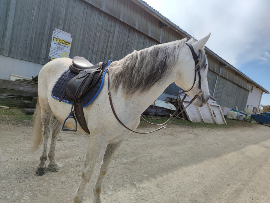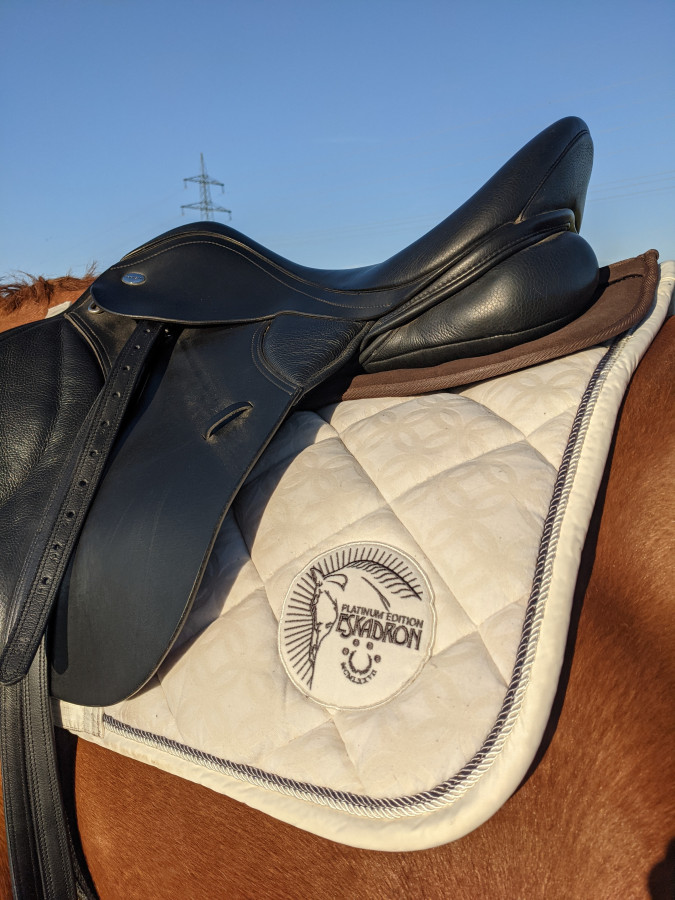 Essai de l'Invictus : ça résoud pas 100% des problèmes, mais Amor semble beaucoup mieux avec. Au trot enlevé je suis retombée une fois un peu brusquement dans ma selle, normalement il se serait creusé et aurait relevé la tête, là zéro réaction, il a même pas bougé l'oreille, comme s'il l'avait pas senti. C'est très impressionnant.