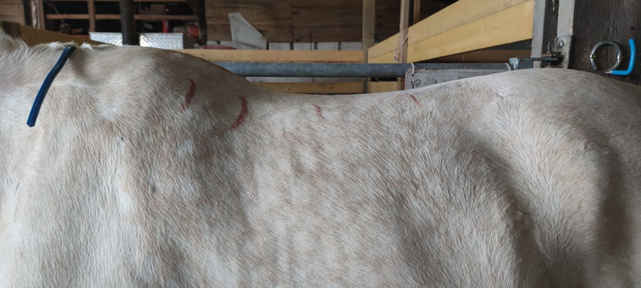 En comparaison du marquage sur le dos d'Eylion pendant la séance de SF (on voit la marque du milieu pour définir le point le plus bas) :