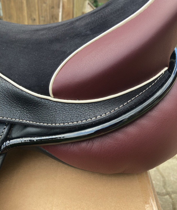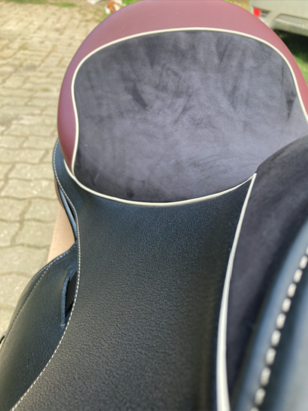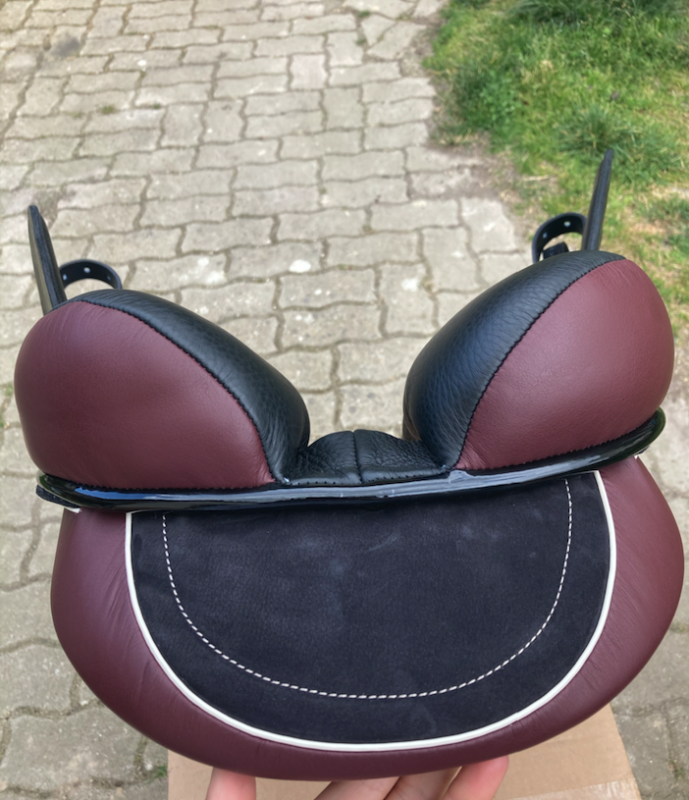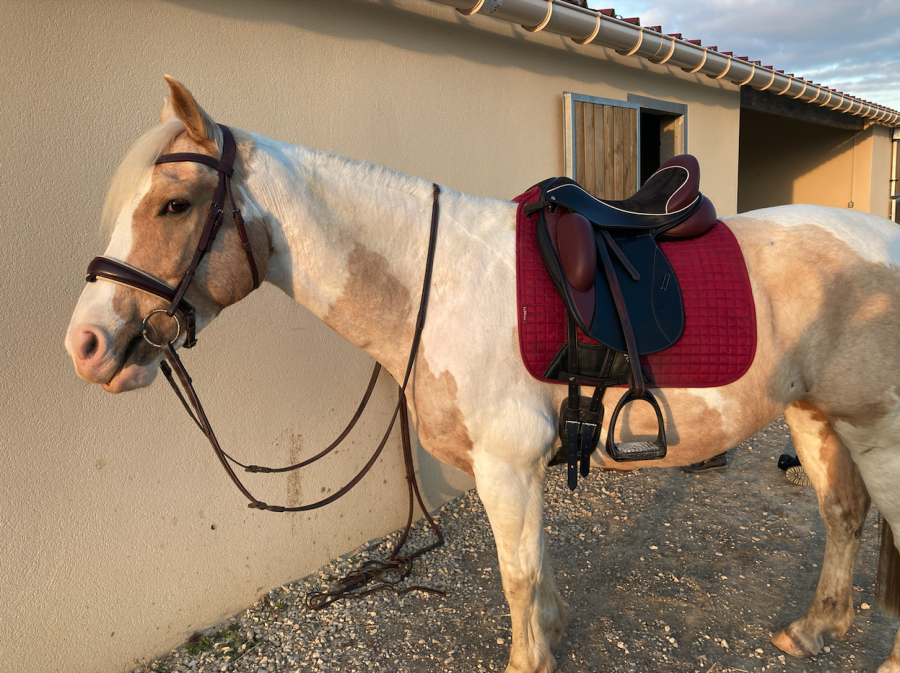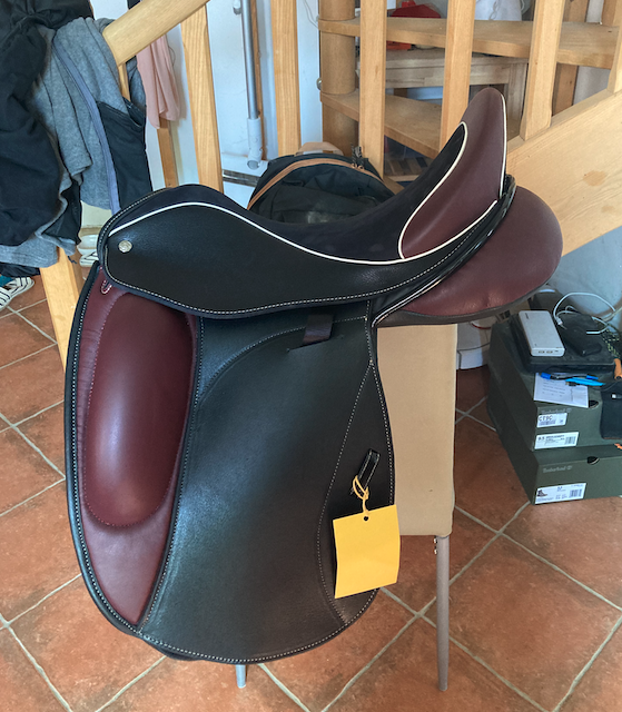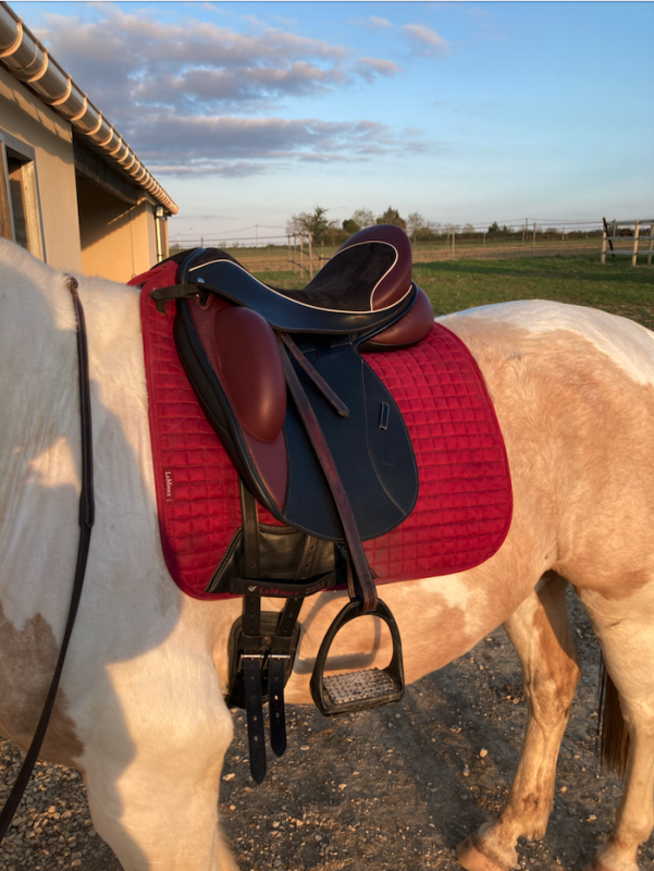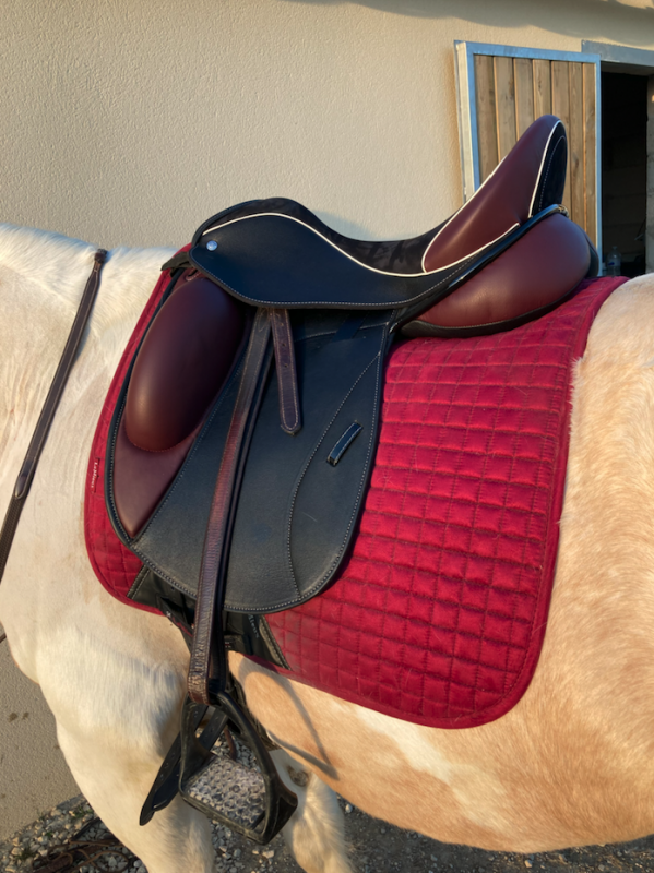 Néanmoins elle va parfaitement avec mon filet et je ne regrette absolument pas ce bi-ton cuir noir/bordeaux. C'est un fauteuil ! Je revis depuis que je l'ai, le poney aussi, les tapis ont arrêtés de reculer ! Bref c'est le bonheur et je ne regrette pas l'investissement ! La laine ça surprend au début car tu es très haut perché mais là ça commence à se tasser et je sens vraiment ce qu'il se passe sous mes fesses c'est bluffant.