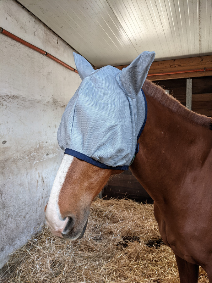 Je trouvais le frontal trop petit et la muserolle aussi. Donc j'ai retiré la sous gorge et remplacé la muserolle par celle du side pull ainsi que le frontal.