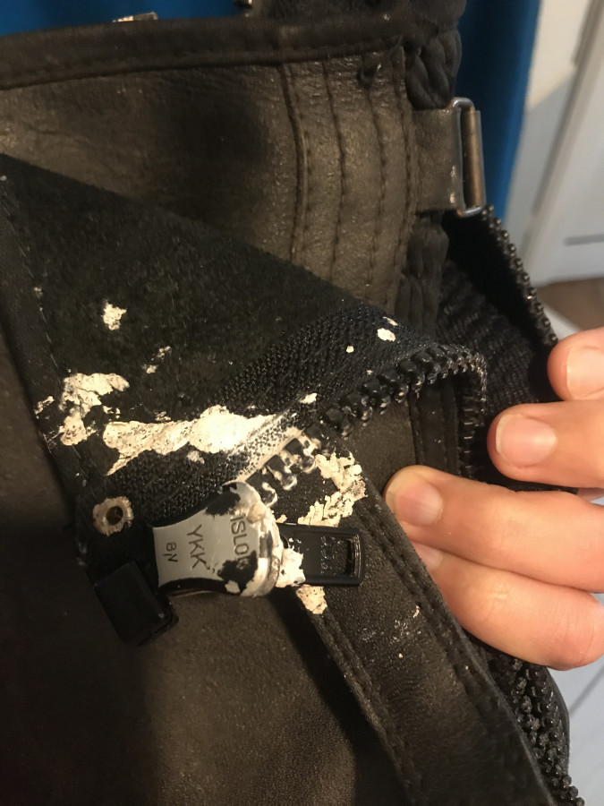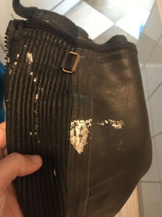 Voilà j’ai retrouvé mes chaps en cuir comme ça. On dirait un chewing-gum ou du style...