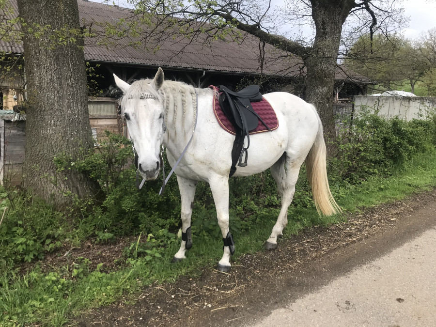 Balade ce matin avant d’aller au travail. Tapis Bordeaux et ensemble synthétique (bridon biothane, selle Wintec et guêtres plastique). Pas super motivée la demoiselle...