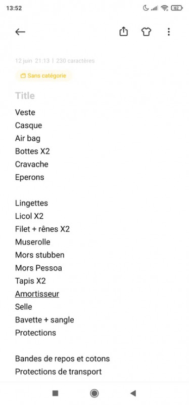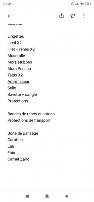 En plus de l’équipement standard, j’ai un licol et une longe de réserve, une paire de rênes et un sac de brosse qui restent dans mon van. Il faut aussi penser à prendre un seau pour l’eau.