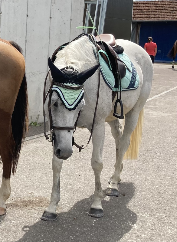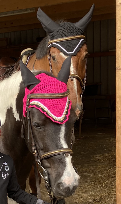Bon petit dilemme… je garde mon bridon brun ou je met le noir/gris pour le prochain concours? J’aurais un tapis noir liseré blanc et un bonnet blanc liseré noir. Mais ma selle est brune, ça je peux pas changer.