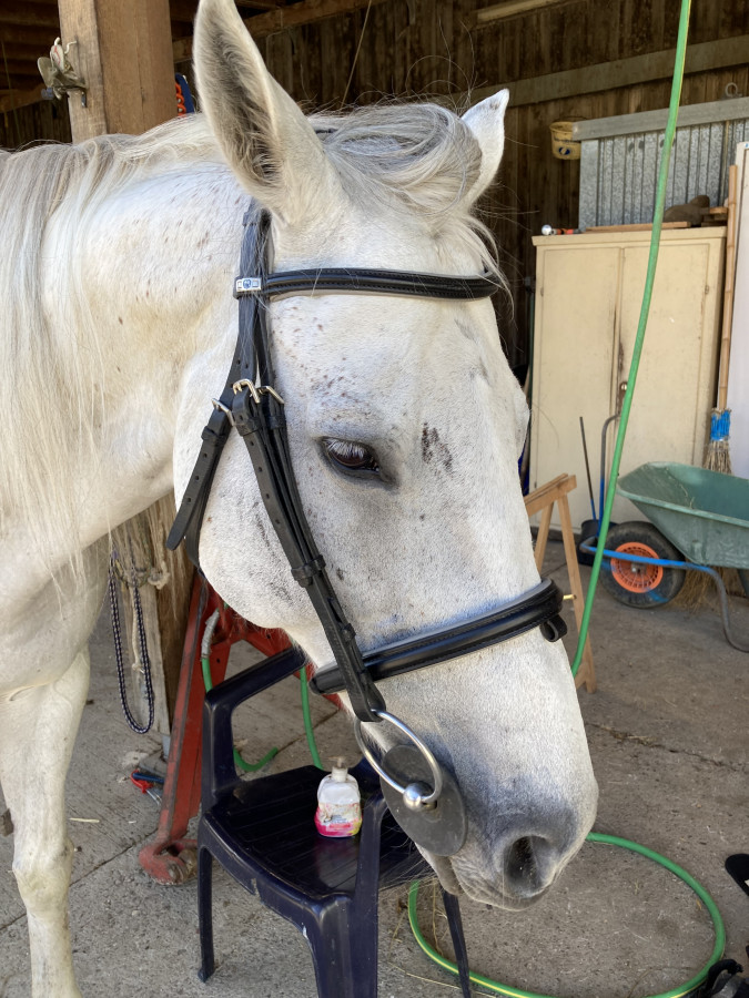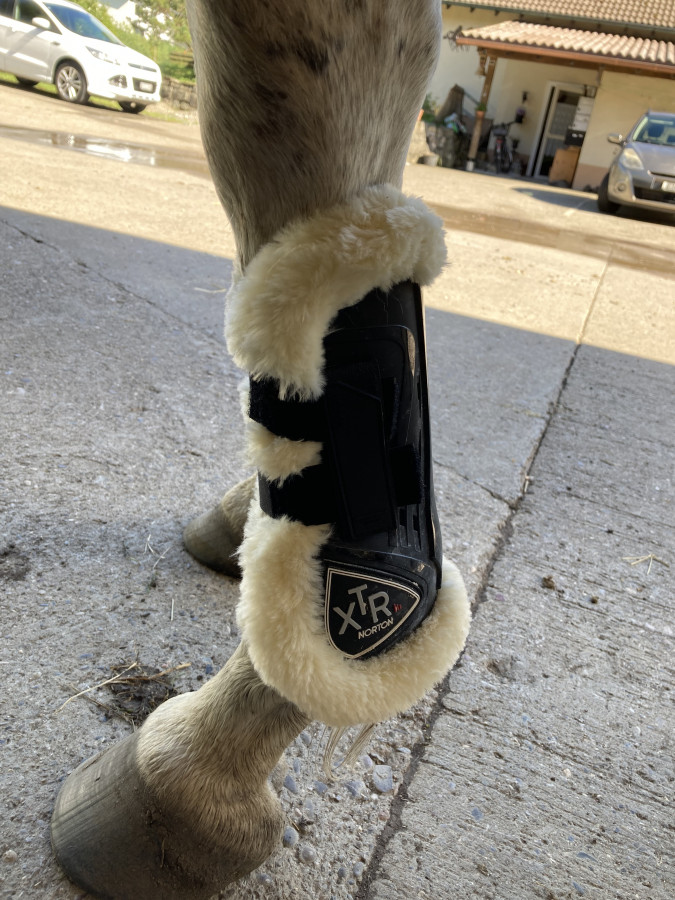 Ici c’était soins… et essayage. Bridon stuebben gris, tip top Nikel et pour les guêtres Norton xtr la fille de la ferme en a… taille poney… donc je sais quoi commander