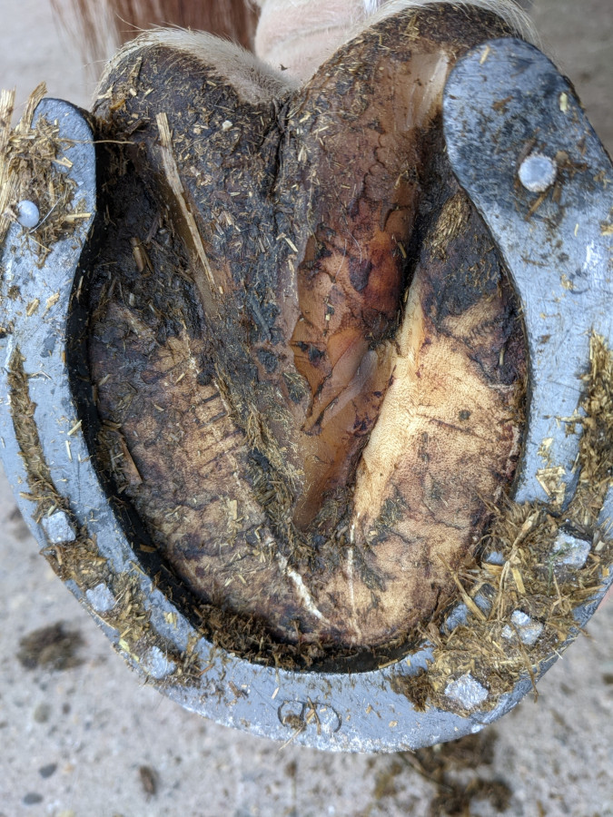 valy29 non il a rien mis. Après 2 jours c'est toujours sec. Le bleu est un peu moins gros, donc je suppose que la cautérisation va suffire. De toute façon vu que la corne est très molle, il va sûrement nous sortir un abcès.