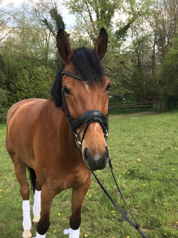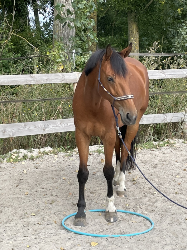 C'est un cheval allemand, qui tournait en 135/140 qd nous l'avons acheté. Avec de super allures, je le travaille sur le plat majoritairement et mes filles à pieds, plat et saut.
