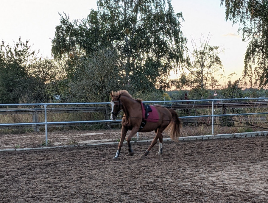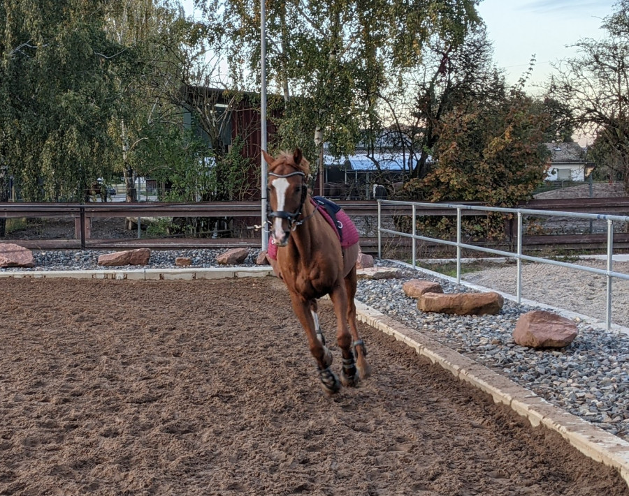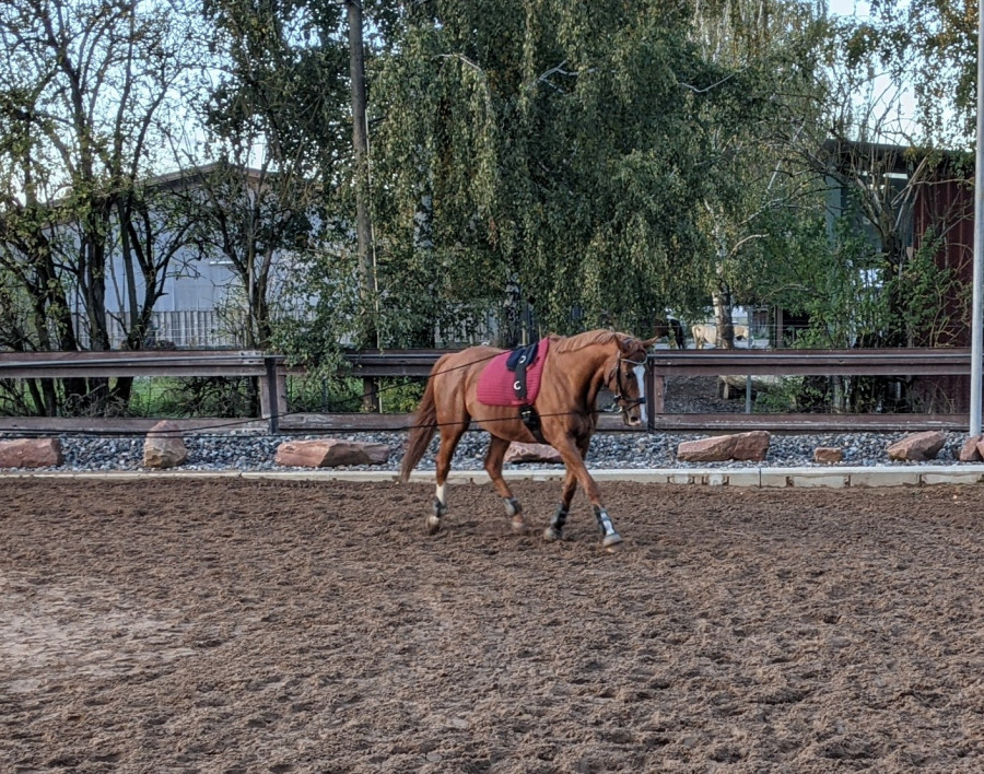 Elle a attaché la rene intérieure sans le surfaix cette fois-ci, seulement pour des raisons de sécurité, vu qu'il avait déjà essayé de faire demi-tour au début. Au final ça lui a beaucoup réussi à main droite, il était plus fixe. A main gauche il aurait été mieux avec la rene qui passe dans le surfaix.