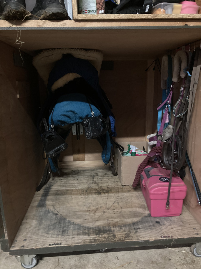 valy29 c’est pour mes filles la caisse. Elles y ont chacune leur selle, un licol et un bridon… ensuite elles vont y mettre leur caisse à brosse, leurs guêtres , leur casque et gants …