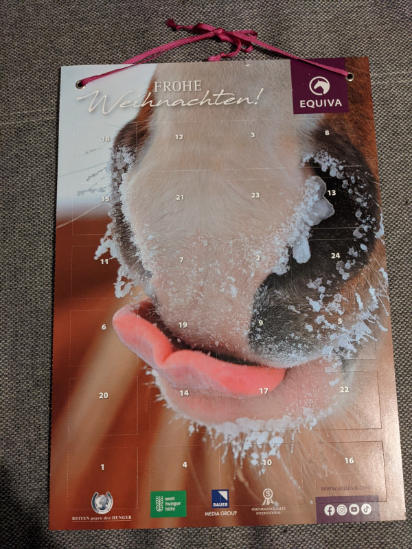 J'ai le calendrier de l'Avent de la sellerie ! Ça sponsorise une forme d'Action contre la faim, et chaque jour il y a des bons d'achat à gagner, le tout encouragé par des grandes marques d'équipement équestre.