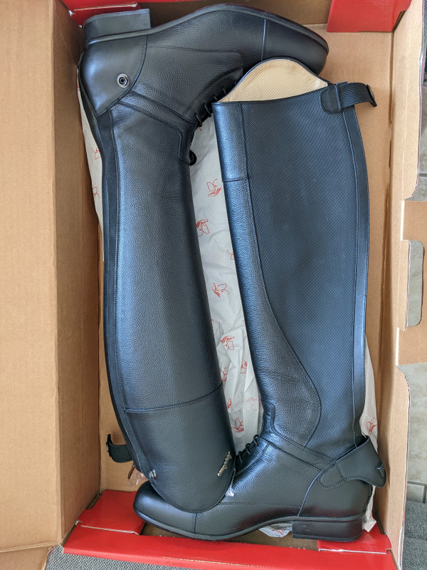 J'ai eu un bon d'achat pour ma réclamation Ariat, et j'ai pu acheter une paire de Sergio Grasso soldées à 150 euros. L'avantage d'avoir une taille pas commune. J'ai dû payer 20 euros de ma poche et c'est tout. Je suis trop contente. Celles-là vont avoir des embauchoirs et un sac à bottes vu la valeur.