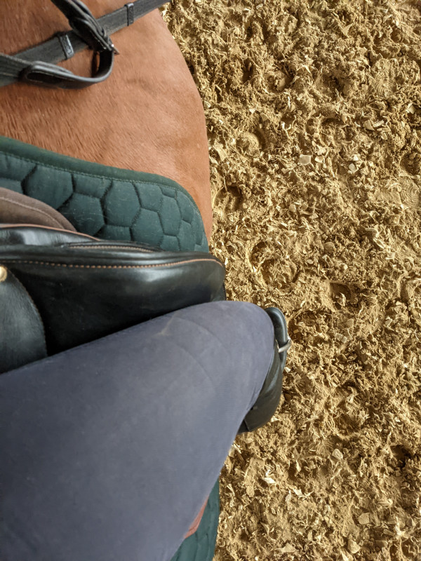 Je commence à comprendre mieux ce que je déteste avec la selle de ma prof. Mes genoux trouvent pas leur place avec les taquets, j'ai les genoux qui sortent vers l'extérieur et les pointes de pieds avec.