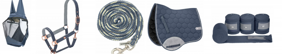 Je suis donc partie sur la couleur Denim clair. J'ai d'abord choisi le masque anti-UV parce que je dois monter avec (ma DP est fragile des yeux), puis le tapis coordonné et je me suis laissée emportée, en ajoutant le local et la longe. Voici donc ma commande, chez Kramer.