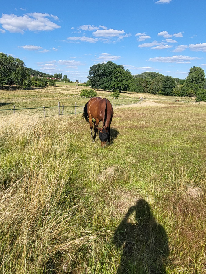 Mon grand henissait au loin et faisait quelques pas le long de la clôture mais aucune panique, à la fin je ne l'entendais même plus. Un gros soulagement.