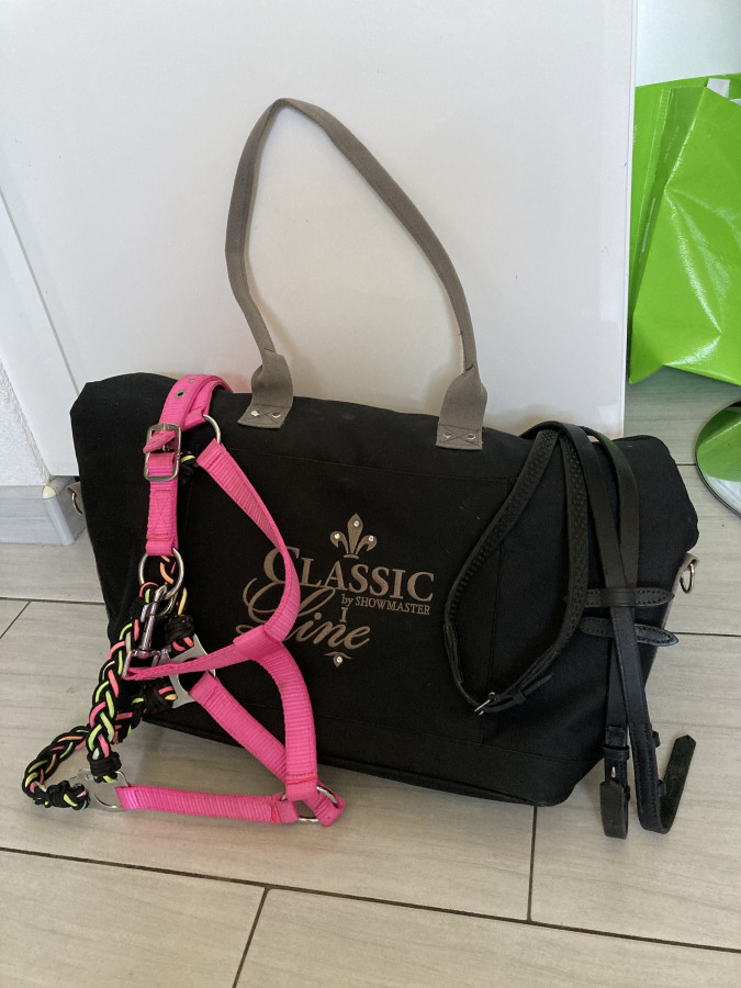 Un grand sac, un licol (j’étais très curieuse de voir comment était fait les tresses) et une paire de renes poney.