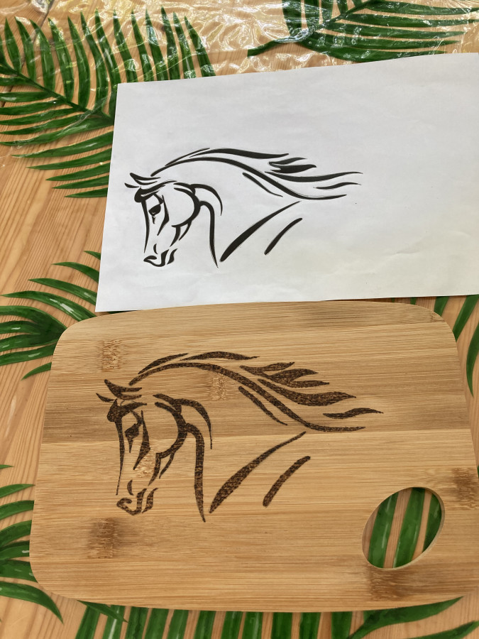 Sinon j’ai l’anniversaire d’une amie samedi . J’ai testé la pyrogravure. Je vous mets la photo du test. C’est une planche en bambou, c’est pas évident
