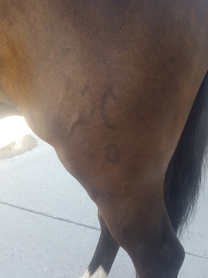 Quand loulou passe du noir au bai sous l'effet du soleil et que son marquage apparaît (j'ai toujours été persuadée qu'il n'avait pas été marqué car on ne voyait rien de rien)
