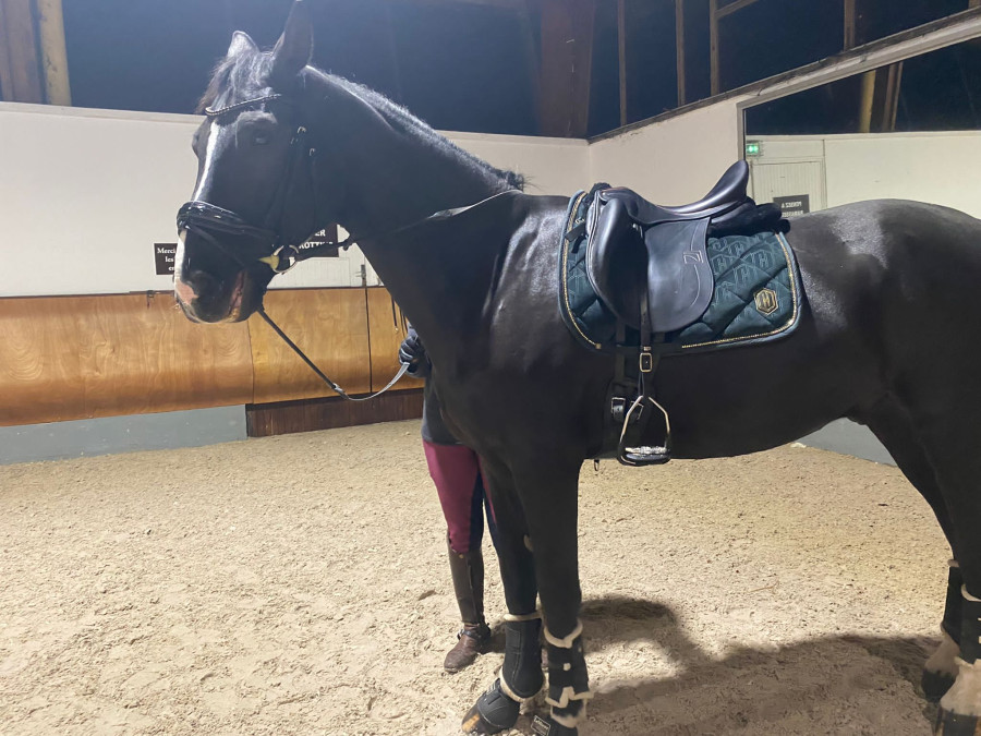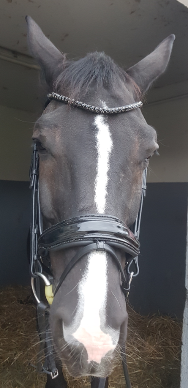 Nouveau filet : têtière anatomique rembourrée, muserolle vernies avec liseré "paillettes", frontal strass noir (je vais surement changer) et des renes incroyables... très bon cuir pour un mini prix, on verra si ça tient dans la durée