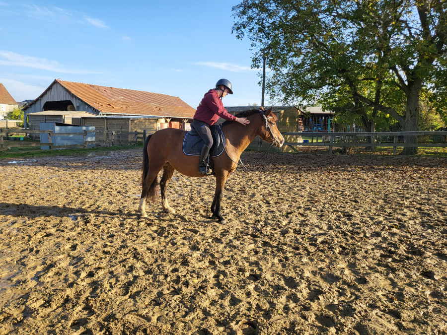20 minutes en carrière avec pas mal de 2 pistes au pas et même au trot ! Petit chat qui fait tout pour comprendre malgré moi qui suis pas claire et qui donne toute sa bonne volonté