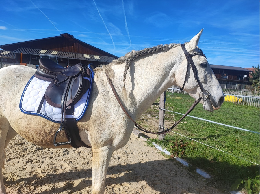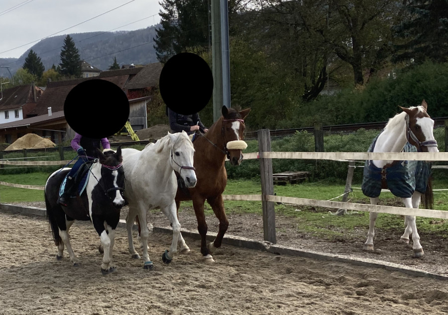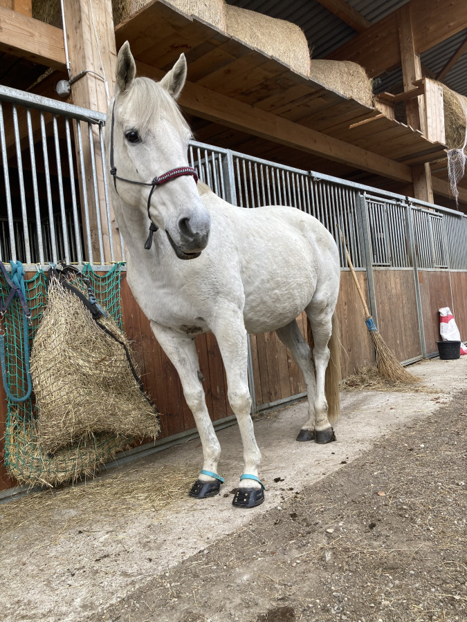 Oui ma grise nous s accompagné, mais j’ai du la mettre dans le petit couvert car lâchée dans la carrière, elle faisait sa crevure… il y avait les chevaux de l’écurie dans les paddocks autour de la carrière.